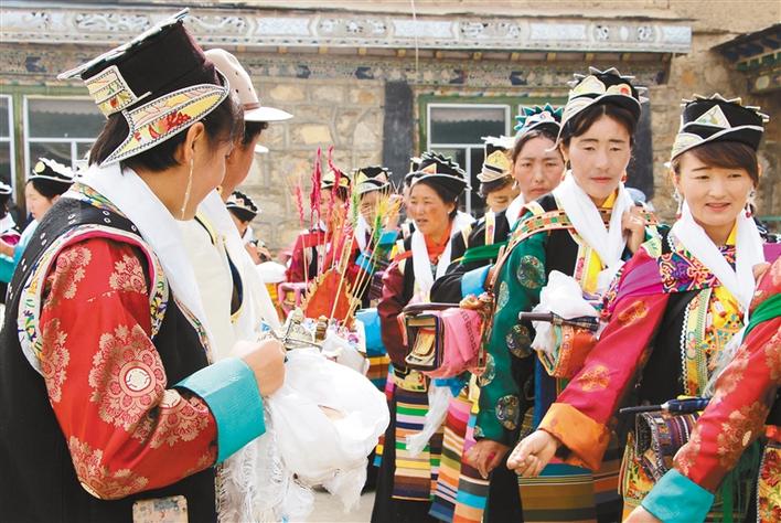 En photo : des gens se souhaitant du bonheur, au village de Zongxue, ville de Shannan, dans la région autonome du Tibet.