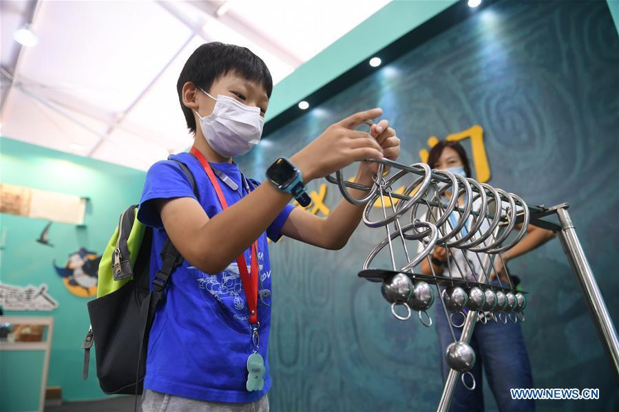 Un jeune gar?on essaie un puzzle d'anneaux chinois dans la zone d'exposition du développement collaboratif de la culture Beijing-Tianjin-Hebei, dans l'Exposition des services culturels du Salon international du commerce des services de Chine (China International Fair for Trade in Services, CIFTIS) 2020, le 7 septembre 2020 à Beijing.