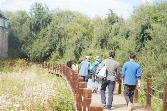 Début septembre, les fleurs et les arbres de la zone humide de Lhalu passent graduellement du vert en été au jaune au début de l'automne. En se promenant le long du sentier piétonnier de la zone humide, les gens peuvent profiter de l'air rafra?chissant à oxygène de première qualité. De temps en temps, ils s'arrêtent pour apprécier le beau paysage le long du chemin, et parfois se rassemblent pour une photo de groupe. Ils peuvent aussi faire des exercices en pleine nature.