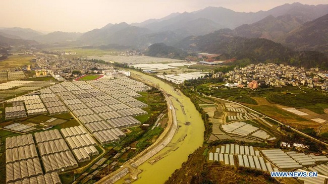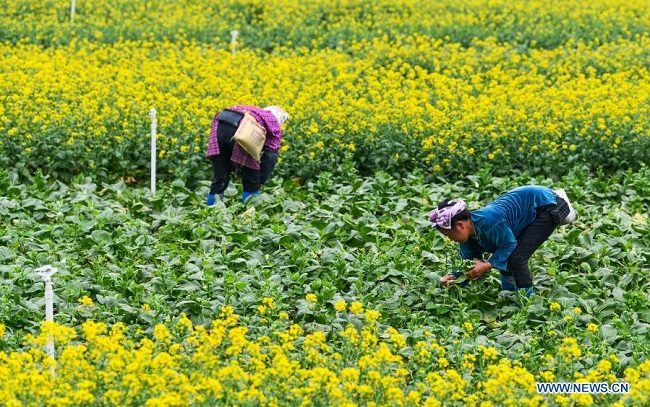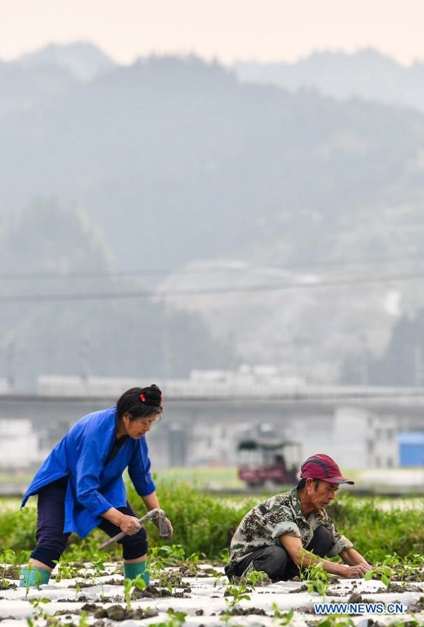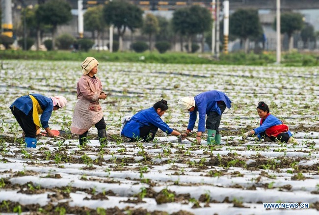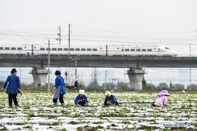 Des agriculteurs transplantent des plants de piment rouge dans le district du barrage de Chejiang, dans le comté de Rongjiang de la préfecture autonome Miao et Dong de Qiandongnan, dans la province du Guizhou (sud-ouest de la Chine), le 15 mars 2021. (Yang Wenbin / Xinhua)
