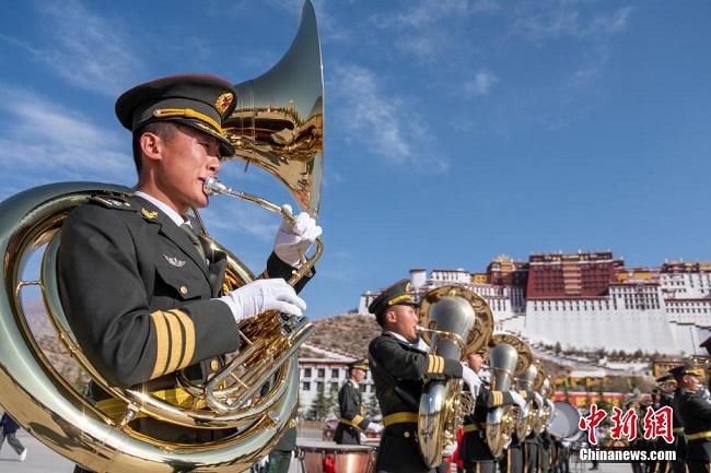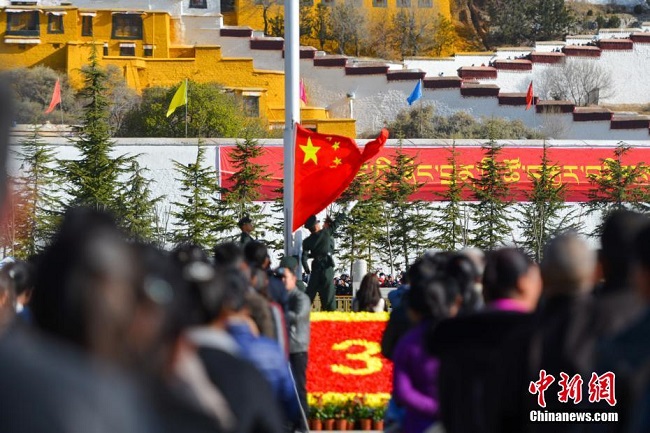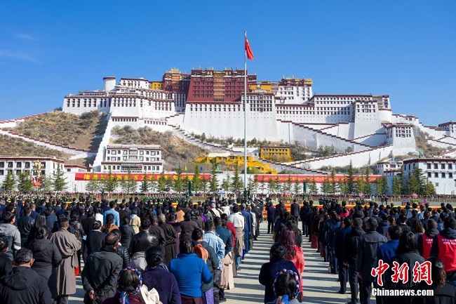 Une cérémonie de lever du drapeau a été organisée le 28 mars sur la place devant le palais du Potala, à Lhassa, chef-lieu de la région autonome du Tibet (sud-ouest), afin de célébrer la ? Journée d'émancipation des serfs ?. (Photos : Zhao Lang/Chinanews)