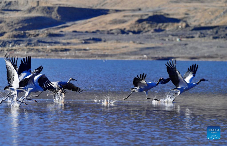 Des grues à cou noir, vues dans le comté de Lhunzhub à Lhassa, capitale de la région autonome du Tibet (sud-ouest de la Chine), le 7 décembre 2021. Environ 1500 grues à cou noir sont arrivées dans le comté de Lhunzhub pour l'hiver. (Zhang Rufeng / Xinhua)