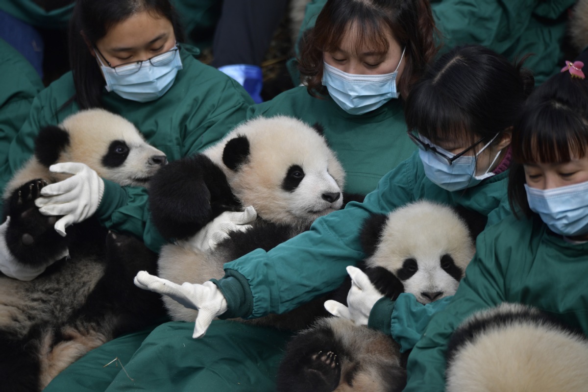 Vingt pandas géants nés en 2021 ont participé le 24 janvier à une cérémonie de la fête du Printemps à la base de Shenshuping du Centre de recherche et de conservation des pandas géants de Chine, dans la province du Sichuan (sud-ouest de la Chine). Un total de 27 petits pandas géants sont nés au centre en 2021. (He Haiyang / chinadaily.com.cn)