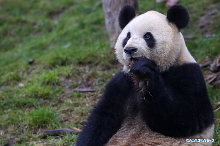 Photo prise le 26 janvier 2022 montrant le panda géant Hao Hao au parc animalier Pairi Daiza à Brugelette, en Belgique. (Xinhua/Zhang Cheng)