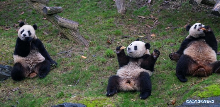 Photo prise le 26 janvier 2022 montrant les pandas géants Hao Hao (centre), Bao Di (à droite) et Bao Mei au parc animalier Pairi Daiza à Brugelette, en Belgique. (Xinhua/Zhang Cheng)