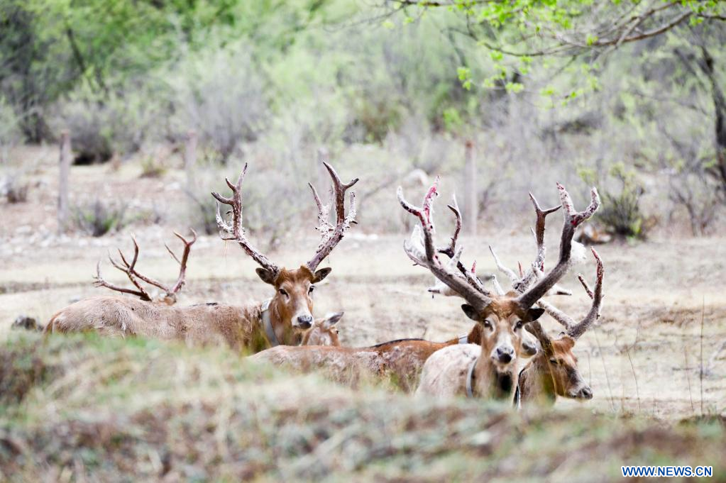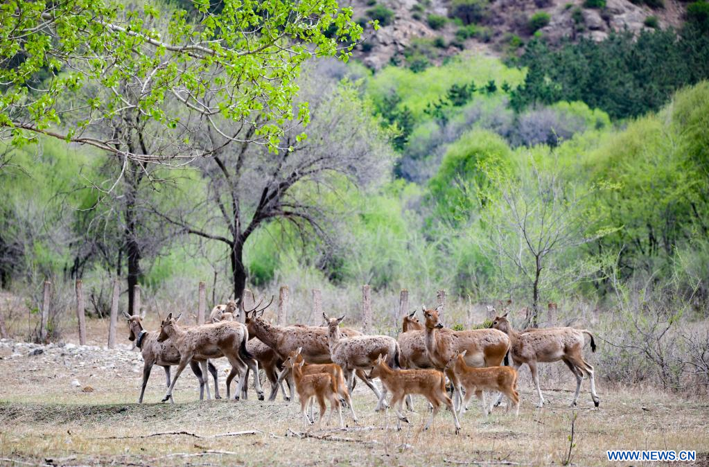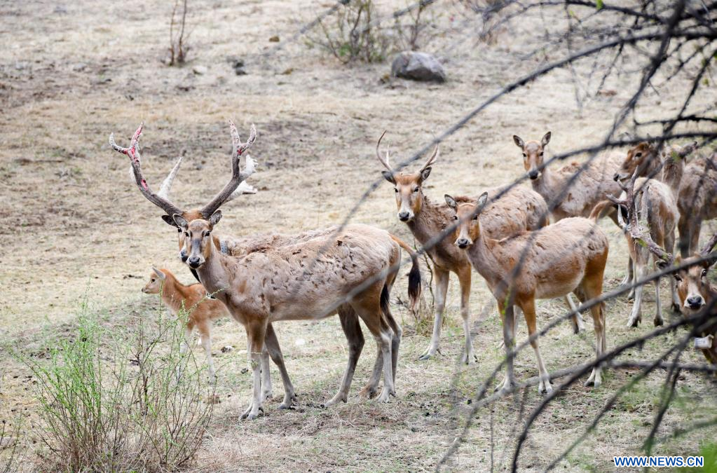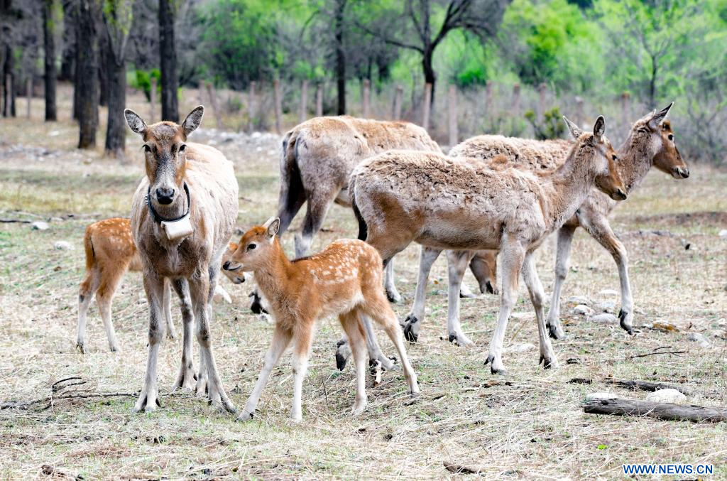 Photo prise le 13 mai 2022 montrant des cerfs de Milu dans la réserve naturelle de Daqingshan à Hohhot, dans la région autonome de Mongolie intérieure (nord de la Chine). (Xinhua/Wang Zheng)