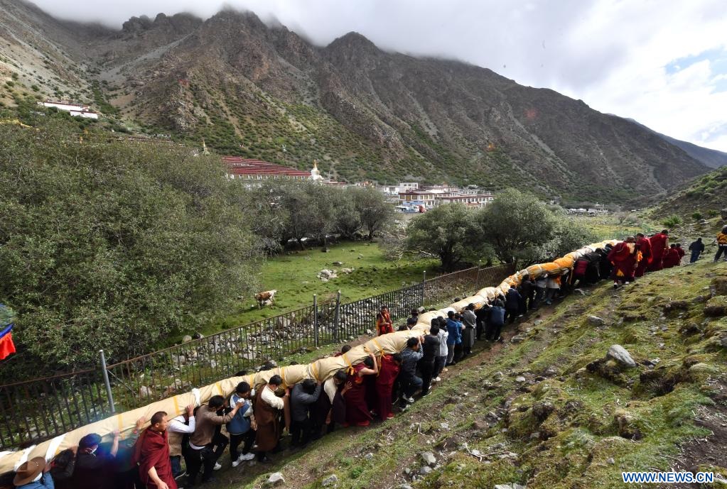 Des moines participent à un rituel annuel d'exposition de tanka de Bouddha au monastère de Tsurphu, dans la région autonome du Tibet (sud-ouest de la Chine), le 11 juin 2022. (Photo : Jiang Fan)