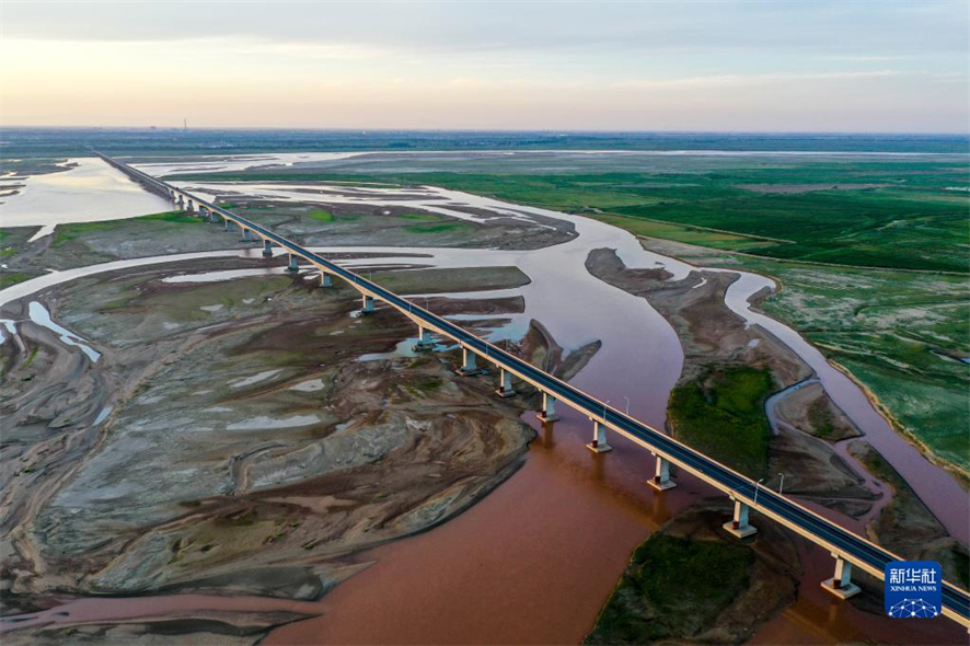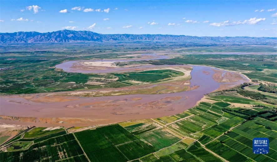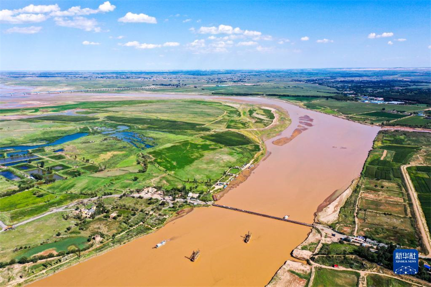 Photo aérienne prise le 16 ao?t, montrant une section du fleuve Jaune à Ordos, dans la région autonome de Mongolie intérieure (nord). Au début de l'autonome, les monts, les prairies et les zones humides des deux c?tés du fleuve Jaune en Mongolie intérieure offrent à la vue un paysage splendide. (Photos : Peng Yuan/Xinhua)
