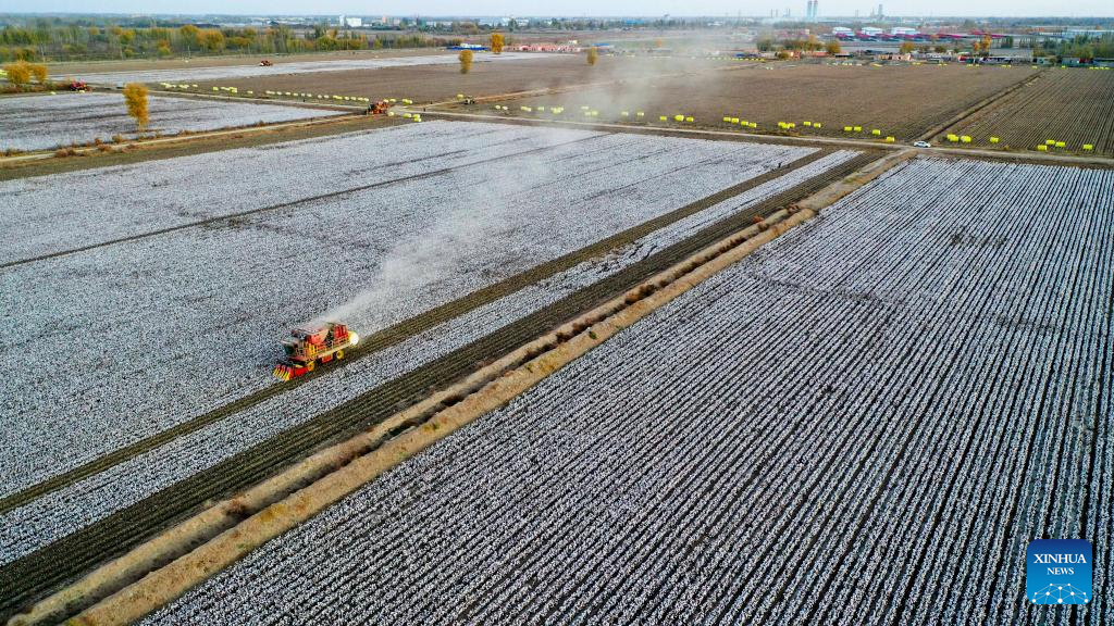 Photo aérienne prise le 10 novembre 2022 montrant une cueilleuse de coton au travail dans le comté de Xayar, dans la région autonome ou?ghoure du Xinjiang (nord-ouest de la Chine). La récolte de coton touche à sa fin dans le comté de Xayar, une base de production de coton de qualité supérieure en Chine. A la date du 11 novembre, 1,706 million de mu (environ 113 733 hectares) de coton avaient été récoltés ici. (Liu Yuzhu / Xinhua)