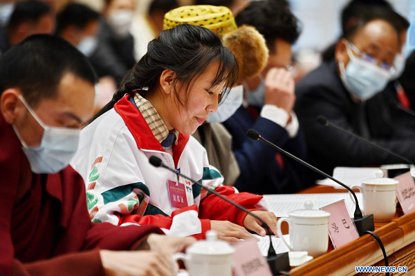 Une lycéenne (deuxième à gauche) prend la parole lors d'un symposium organisé à l'occasion de la 15e Journée d'émancipation des serfs, à Lhassa, dans la région autonome du Tibet (sud-ouest de la Chine), le 28 mars 2023. La 15e Journée d'émancipation des serfs tombe mardi. (Photo : Zhang Rufeng)