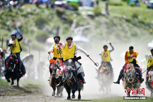 Le 16 ao?t, les villageois du village de Sibug, canton de Tashigang, district de Maizhokunggar, ville de Lhassa, au Tibet, ont organisé une course traditionnelle de yaks pour célébrer le festival de Shoton.