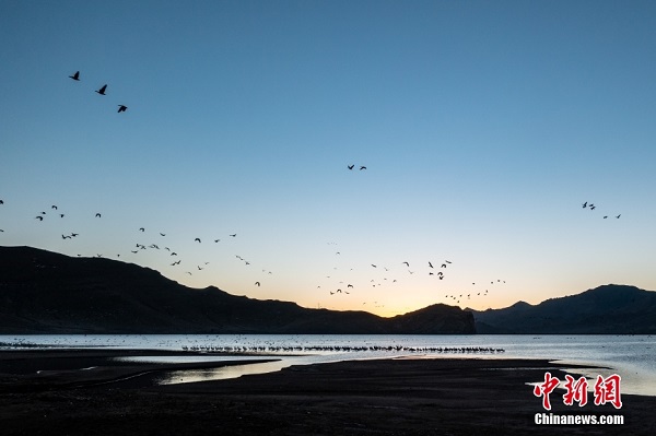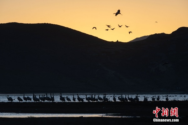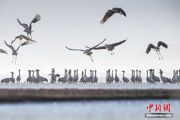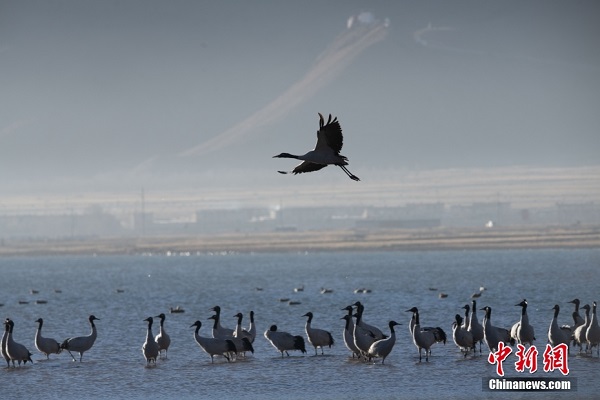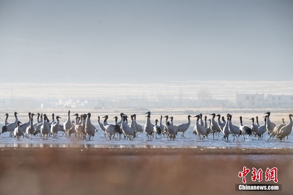 Le 19 novembre au matin, dans la réserve de grues à cou noir du comté de Lhundrup, à Lhassa, au Xizang, les grues à cou noir se nourrissent et s'amusent. Le comté de Lhundrup, au nord de Lhassa, se situe à une altitude moyenne d'environ 4200 mètres et il est l'un des principaux lieux d'hivernage des grues à cou noir. Actuellement, environ 2000 grues à cou noir ont migré ici pour passer l'hiver.