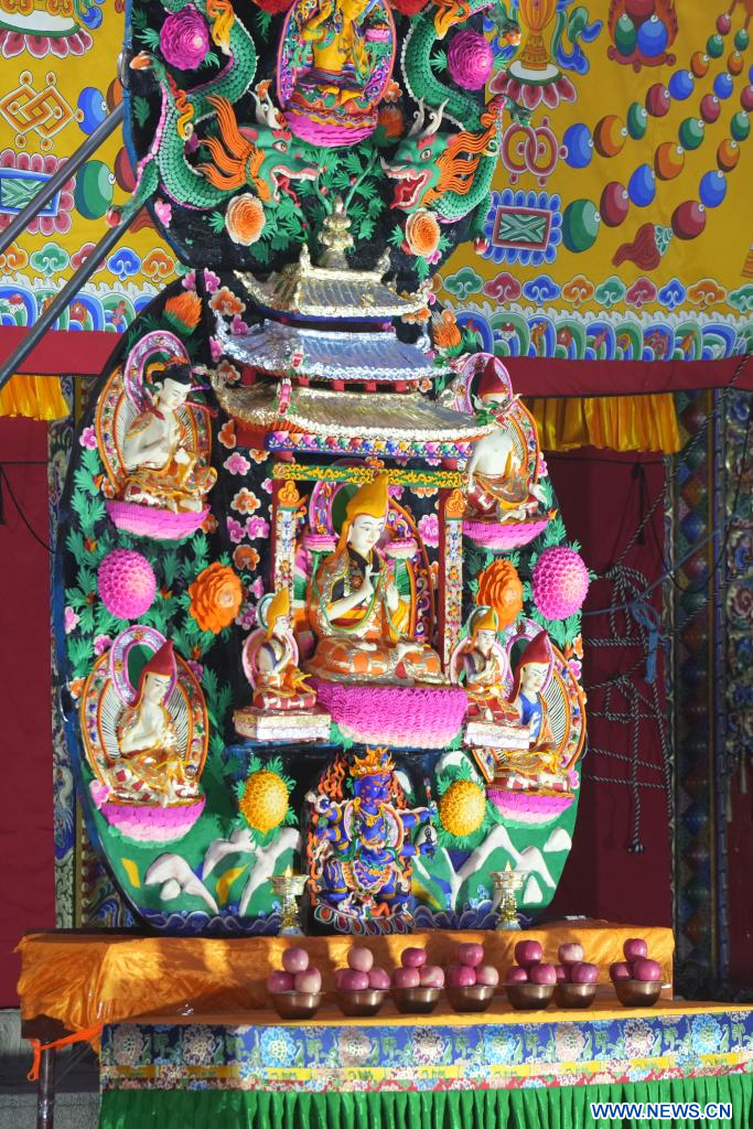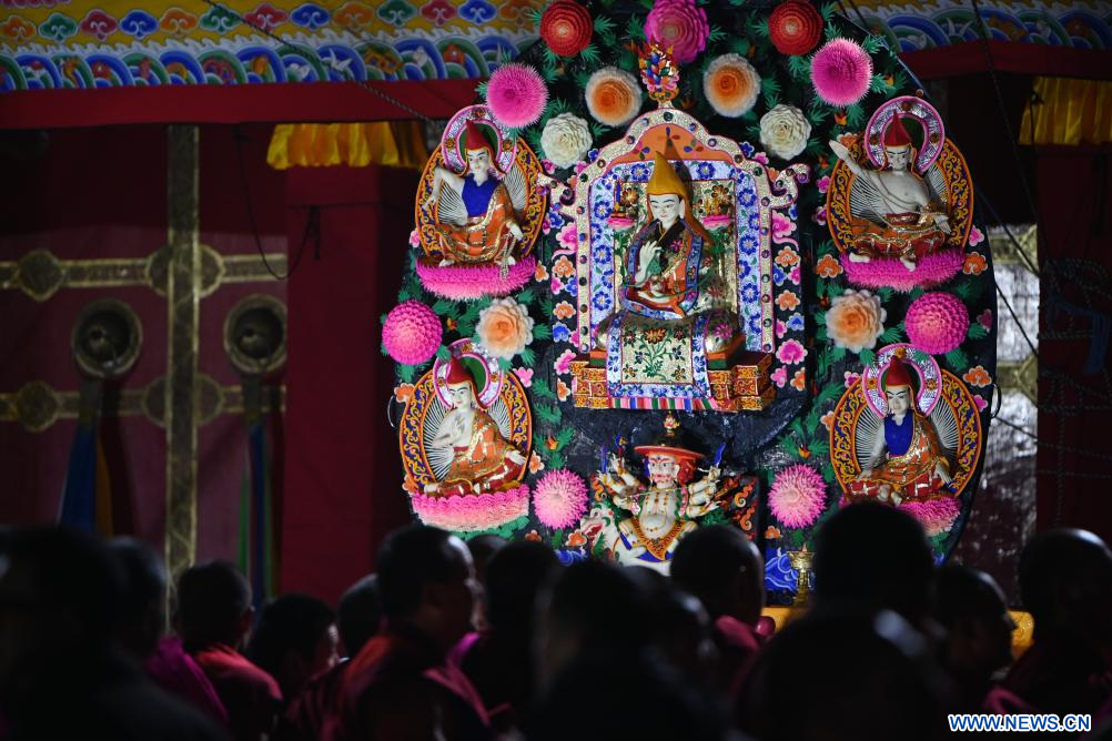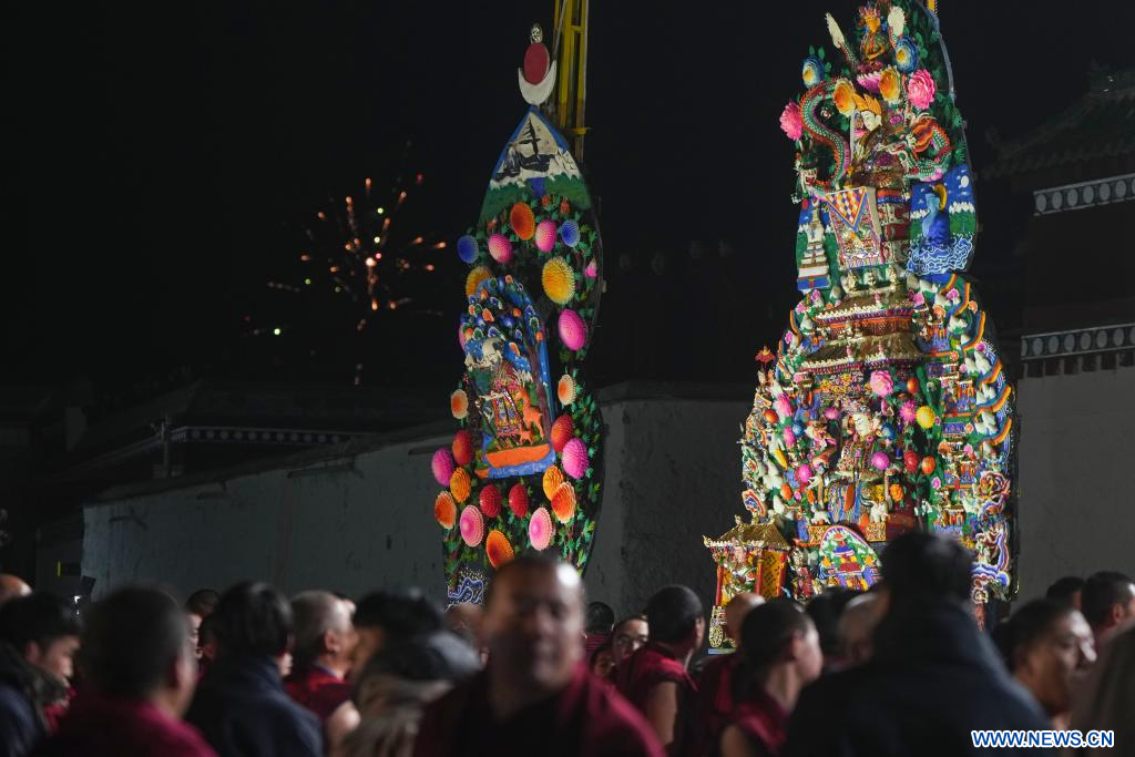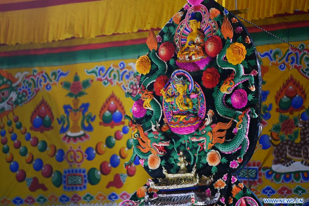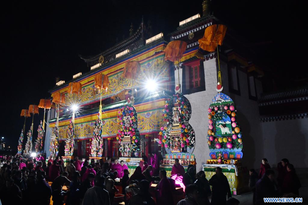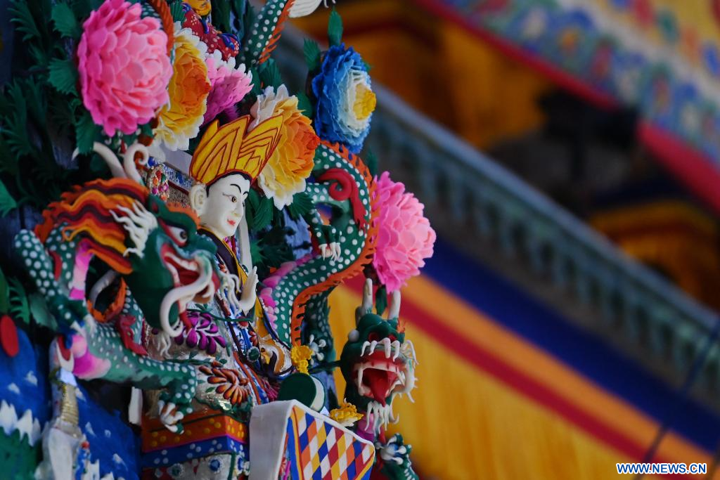 Des sculptures de beurre réalisées par des bouddhistes sont exposées au monastère de Labrang dans le district de Xiahe, dans la province chinoise du Gansu (nord-ouest), le 24 février 2024. Une exposition annuelle de sculptures de beurre s'est tenue au monastère de Labrang, l'un des six plus importants monastères de la secte Gelug du bouddhisme tibétain, samedi, à l'occasion de la fête des lanternes, pour prier pour la bonne fortune et la bonne récolte. (Photo : Chen Bin)