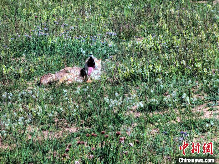 Un renard tibétain baille sur l'herbe à la baie de Jinsha du lac Qinghai.