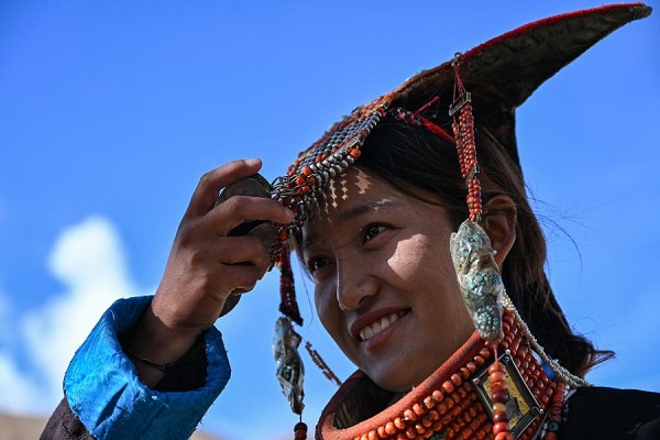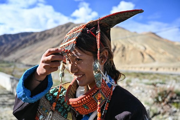 Une villageoise présente un costume folklorique dans le village de Kejia du district de Pulan, dans la région autonome du Xizang (sud-ouest de la Chine), le 9 septembre 2024.(Photo : Sun Ruibo)