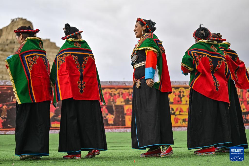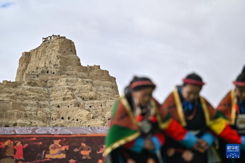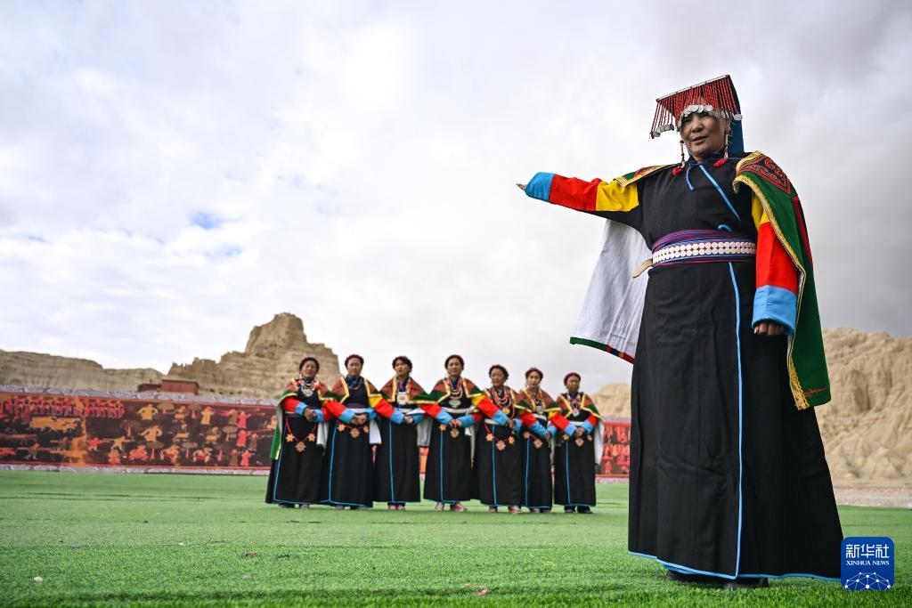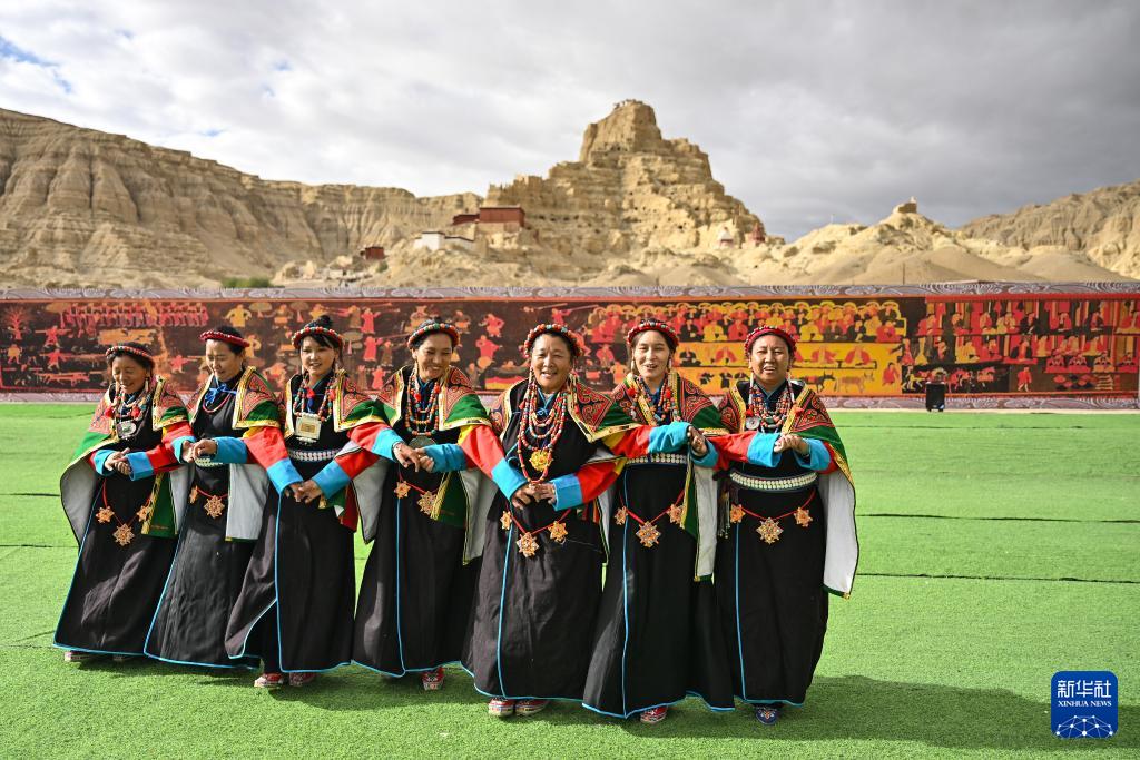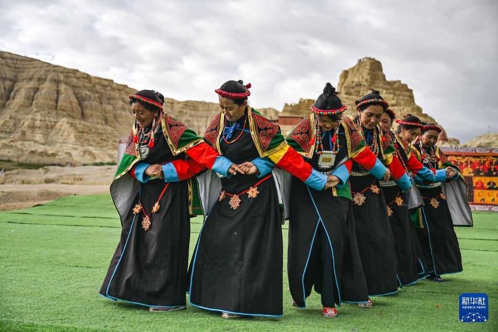Photo prise le 11 septembre, montrant des Tibétains dansant le traditionnel ? xuan ?, près du site des ruines du royaume Guge, situé dans la préfecture de Ngari, dans la région autonome de Xizang. Intégrant des éléments issus de l'opéra et du chant tibétains, cette danse a été inscrite sur la liste du patrimoine culturel immatériel national en 2008.