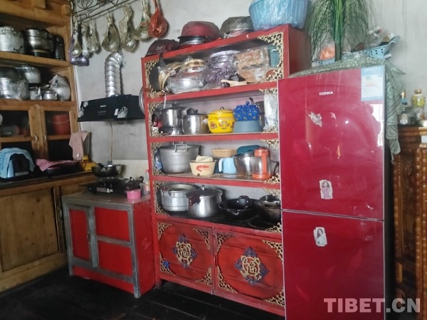 En photo : la cuisine propre et bien rangée de Pema Lhamo.