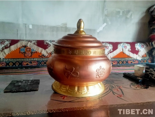 En photo : la bo?te à tsampa, un souvenir célébrant le 70ème anniversaire de la libération de Chamdo, chez Pema Lhamo.