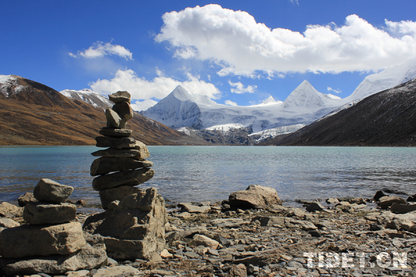 Les sommets restent gelés toute l'année. Au pied de la montagne, la fonte des glaciers a formé un lac d'une clarté semblable à celle d'un miroir - le lac Samutso.