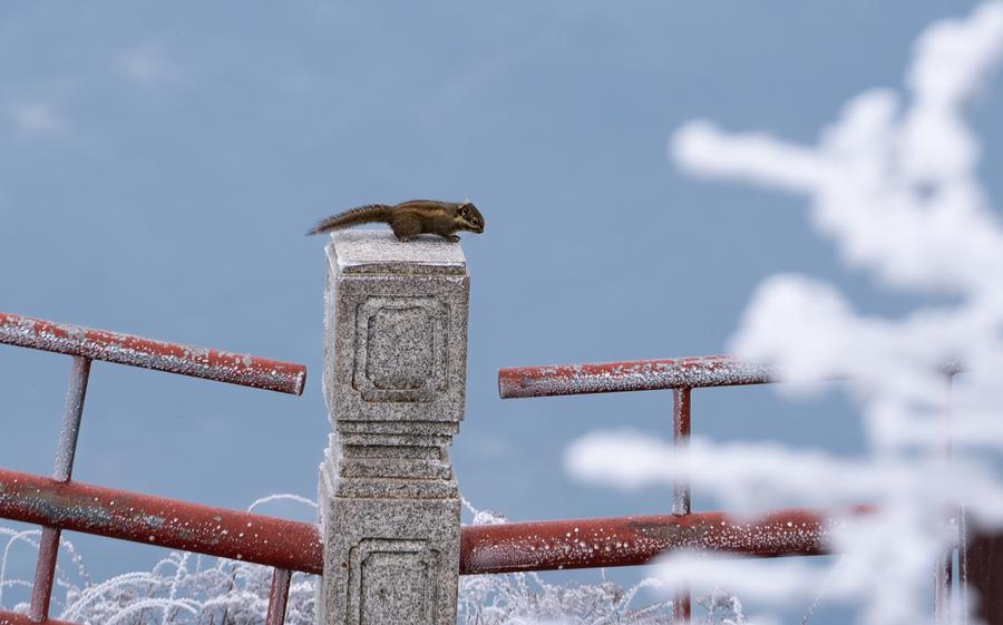 Un écureuil au sommet du mont Emei, recouvert de neige, dans la province chinoise du Sichuan (sud-ouest), le 20 novembre 2024. (Photo : Jiang Hongjing)