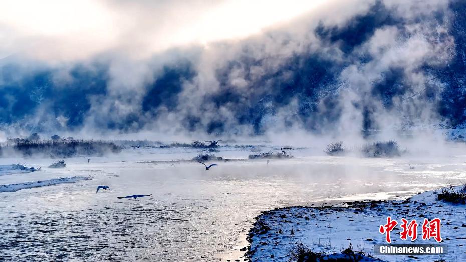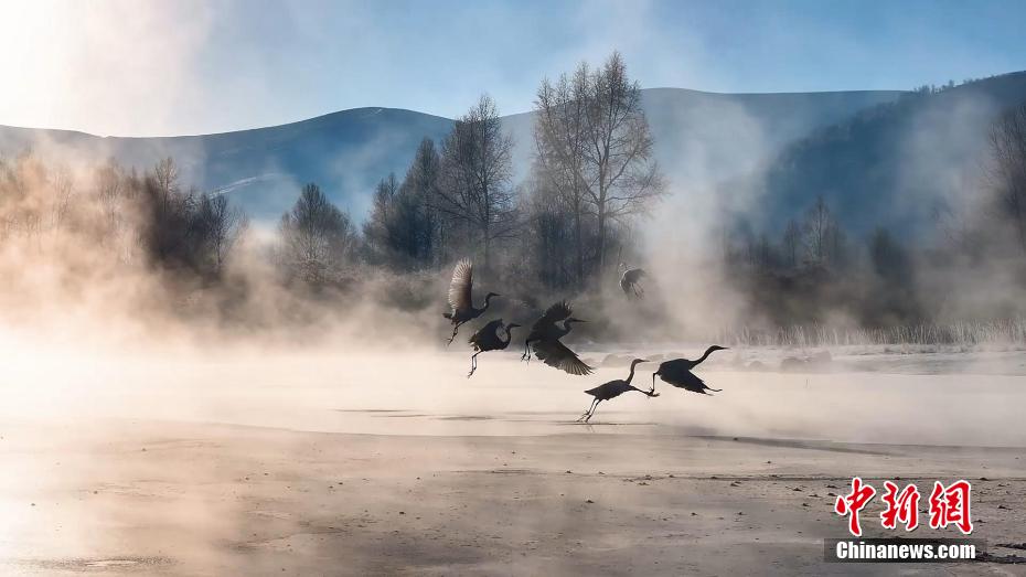 La rivière Haomen, encore partiellement gelée, est bordée d'arbres ornés de givre, tels des robes immaculées. Sur ces scènes, les montagnes brumeuses et voilées se mêlent aux teintes verdatres fumées, tandis que des grues à cou noir dansent gracieusement au bord de la rivière, semblables à des fées évoluant dans un paradis enchanteur.