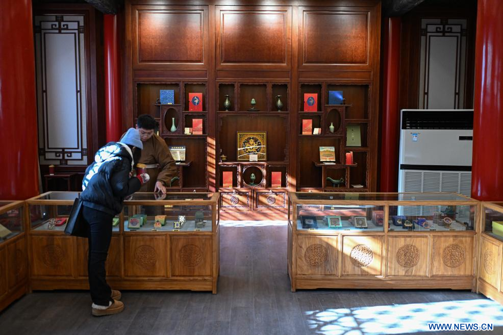 Une touriste achète des produits culturels et créatifs dans le complexe du palais Qingcheng, à Beijing, capitale de la Chine, le 21 décembre 2024. Le complexe du palais Qingcheng, un lieu de sacrifice royal situé le long de l'axe central historique de Beijing, a été ouvert samedi au public après des travaux de restauration. Construit sous la dynastie des Ming (1368-1644), le palais est situé à l'intérieur de l'Autel du dieu de l'agriculture, également appelé temple Xiannongtan. Le palais était autrefois connu sous le nom de Zhaigong, qui se traduit littéralement par le palais du je?ne. C'était un lieu où les empereurs s'abstenaient de prendre des repas copieux et méditaient avant le culte. Il a été rebaptisé palais Qingcheng sous la dynastie des Qing (1644-1911), devenant un lieu où les empereurs tenaient des rituels de célébration après les cérémonies de culture tout en priant pour une bonne récolte. Les travaux de restauration des batiments anciens ont commencé en juin de l'année dernière, selon le principe de "l'intervention minimale". (Photo : Chen Zhonghao)