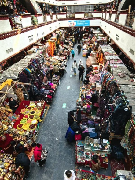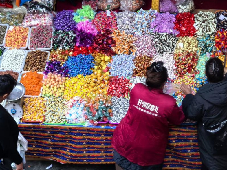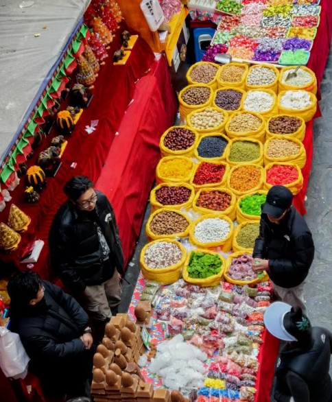 à l'approche du Nouvel An tibétain, les rues et ruelles de Lhassa sont en pleine effervescence. Les marchés spécialisés, supermarchés et boutiques rivalisent d'offres pour proposer une grande variété de produits du Nouvel An. Les étals débordent de marchandises colorées, et la foule se presse pour faire ses emplettes. La vieille ville de Lhassa célèbre avec joie et harmonie l'arrivée imminente du Nouvel An tibétain.