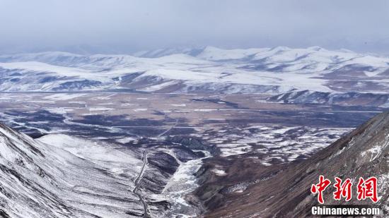 Le marquage routier dans la zone panoramique du pic enneigé de Gangshika.