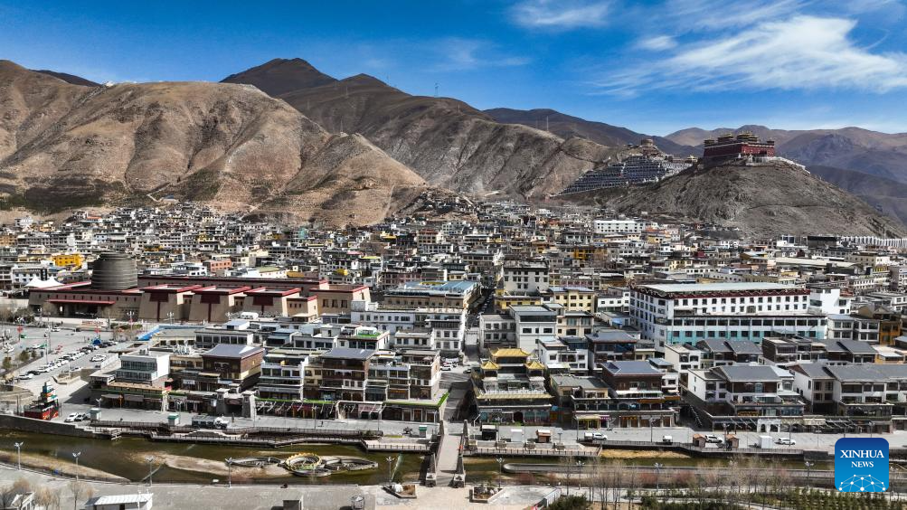 Vues du ciel, les maisons densément construites de la ville de Yushu, situées dans la préfecture autonome tibétaine de Yushu, dans la province du Qinghai (nord-ouest de la Chine) apparaissent nichées dans les vallées de montagne, tandis que la rivière Batang serpente à travers la ville comme une ceinture de jade.