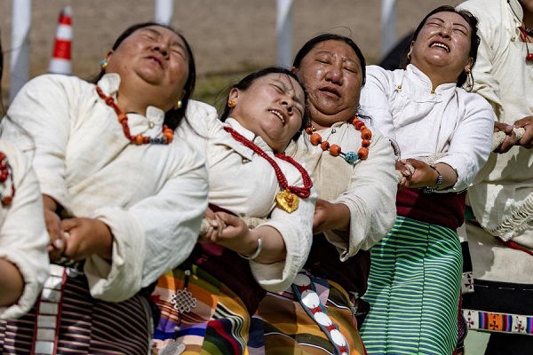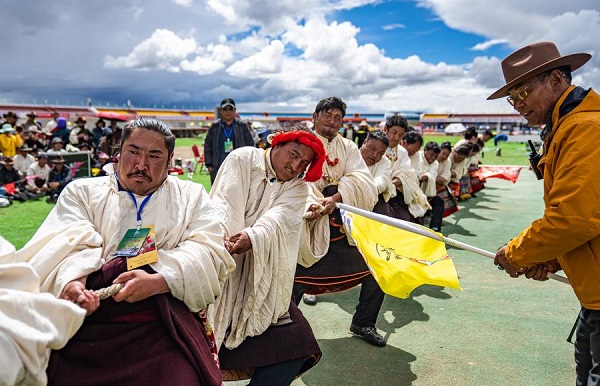 Des concurrents participent à un jeu de tir à la corde lors de l'édition 2025 d'un festival traditionnel de courses hippiques à Nagqu, dans la région autonome du Xizang (sud-ouest de la Chine), le 6 septembre 2025. (Photo : Jiang Fan)