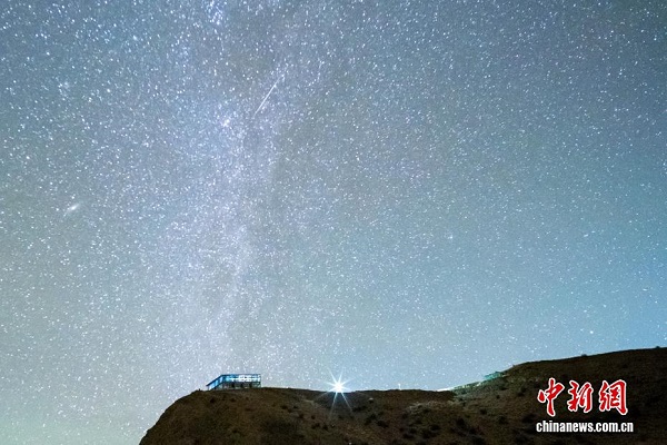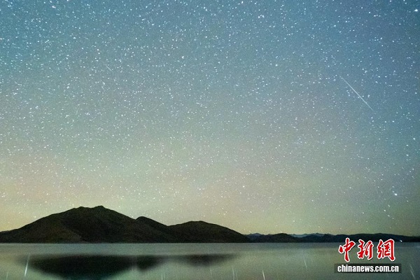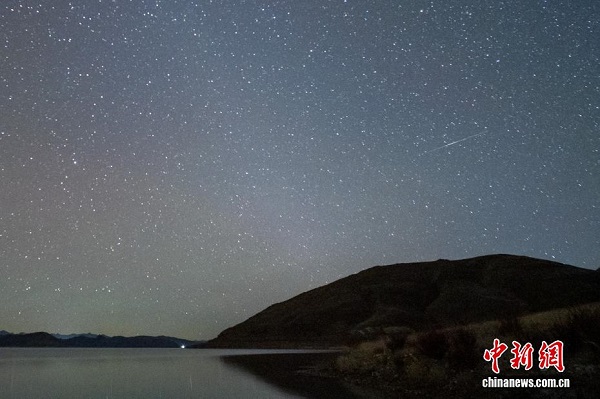 Le lac Yamzhog Yumco, abrégé en ? Yam ?, est appelé en tibétain le ? lac de jaspe ?. Situé à plus de 4 400 mètres d'altitude, il est l'un des trois grands ? lacs sacrés ? du Xizang. Dans la nuit du 13 au 14 décembre, la pluie de météores des Géminides a atteint son apogée, tra?ant sans cesse des sillons lumineux dans le ciel au-dessus du lac Yamzhog Yumco, offrant un spectacle à couper le souffle.