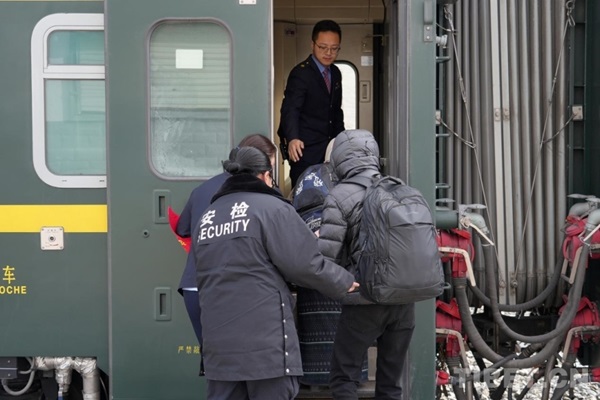 Sur la photo : Le personnel de la gare aide des passagers à monter à bord.