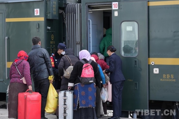 Sur la photo : Sangye Phuntsok, responsable du service passagers de la gare, s'entretient avec des voyageurs.